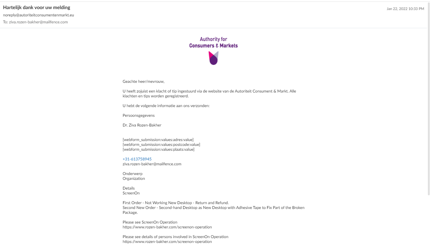 On 22 January 2022, a complaint was given to The Netherlands Authority for Consumers and Markets (ACM) about ScreenOn Operation.