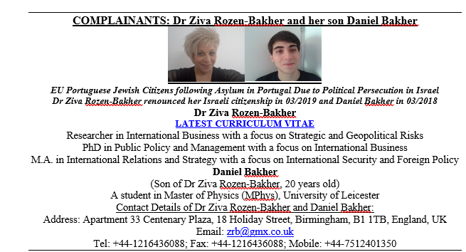 Complaint against the International Conspiracy Group, namely the ‘Israeli Cover-up Group and its European Conspirators’ that are committed Crimes against Dr Ziva Rozen-Bakher and her son Daniel Bakher in Europe in order to Cover-up Attempts of Murders and other Serious Crimes, as part of the Single Set of Cover-up Crimes that are committed in Europe by the ‘Israeli Cover-up Group and its European Conspirators’ in order to Obstruct the Justice and Prevent from High-rank Figures getting Punishment for their Crimes.