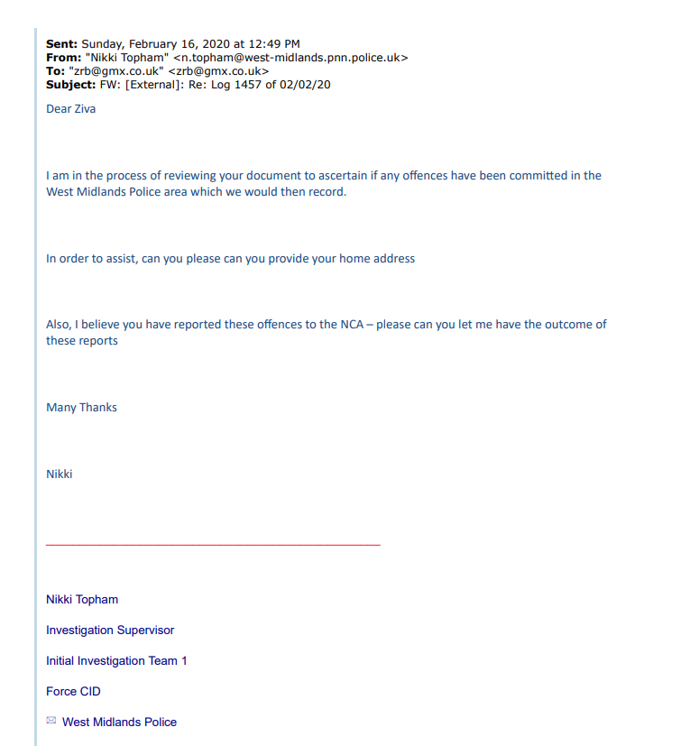 On 2 February 2021, the complaint was given at Birmingham Central Police Station of West Midlands Police, England, UK. The complaint was given with all the documentation including the copy of the complaint to the Portuguese Police and the Claim to ICC. The police officer that opened the complaint informed us that in the coming days a police officer will invite us to the police station to get information about the complaint. Despite it, no one invites us to the police station and instead, we got an email from a police officer with a request to send by email the documentation of the complaint, despite that we are already provided it at the police station. Worse, after that, we got an additional email from Mr. Nikki Topham, the Investigation Supervisor with three awkward requests (see below): i) to provide our address, despite that it should appear in the police system under Log 1457 of 02/02/2020, as well as on the front page of the complaint. ii) the investigator asked if any offences have been committed in West Midlands Police area, despite that it mentioned in the complaint. iii) the investigator asked us to give him a report about the outcome of NCA, despite that we remind him that no one can give a direct complaint to NCA, but only a copy of the complaint to inform NCA about a case, yet the regional police could formally forward the complaint to NCA (see our answer below). A day after that, Mr. Nikki Topham, the Investigation Supervisor, informed us by email that West Midlands Police is not going to investigate our complaint. No formal letter was received from West Midlands Police about closing the complaint, despite our request to get a formal letter about it.