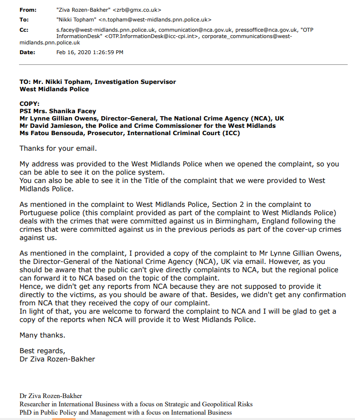 On 2 February 2020, Dr. Ziva Rozen-Bakher and her son Daniel Bakher gave the full hard copy of the complaint to West Midlands Police at Birmingham Central Police Station, England, UK, Snow Hill Queensway, Birmingham B4 6NQ, England, UK. Log Confirmation for receiving the complaint from West Midlands Police, Log: 1457-02/02/2020