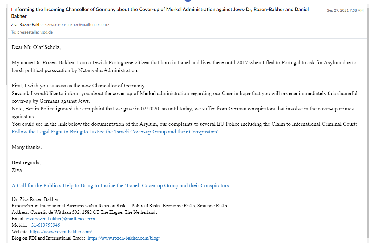 On 27 September 2021, Dr. Rozen-Bakher sent a complaint to Mr. Olaf Scholz, the Incoming Chancellor of Germany about the Cover-up by the Merkel Administration regarding ICCG Operations. No response was given to this letter. See the Letter below.