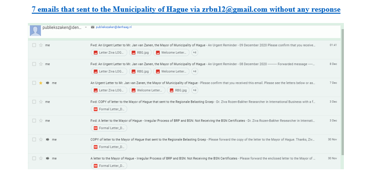 On 9 December 2020, an additional email reminder was sent regarding the Second letter to the Mayor of Hague about not receiving the BSN certificates. No email confirmation and no email reply was given. However, the Municipality of Hague contacted Dr. Rozen-Bakher by phone and promised to send the BSN certificates. Nevertheless, Dr. Rozen-Bakher NEVER gets any formal response by email or by post from the Municipality of Hague regarding her complaint letters.