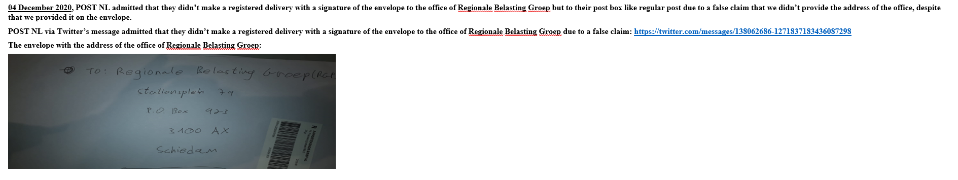 On 7 December 2020, Dr. Rozen-Bakher sent a second letter to the Mayor of Hague about not receiving the BSN certificates. The letter was sent by registered post and via email. No email confirmation and no email reply was given to this letter. On the same date, Dr. Rozen-Bakher sent a second letter to the Regionale Belasting Groep about the inability to pay the regional Dutch tax due to not receiving the BSN certificate. The letter was sent by registered post. No response was given to this letter from RGB.