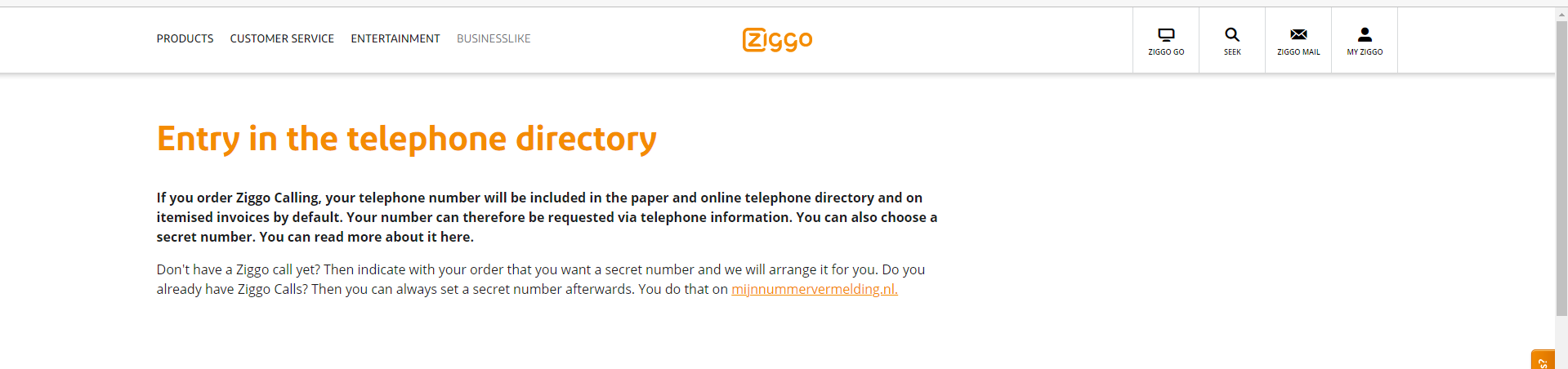 OP046, Ziggo Operation: ‘Secret Landline’ was Defined in the Telephone Directory of Netherlands to Block Incoming Calls and Faxes, while Incoming Calls From Mijnnummervermelding.nl were Blocked when Repeated Attempts were Carried Out to Change the Status to ‘Visible Landline’
