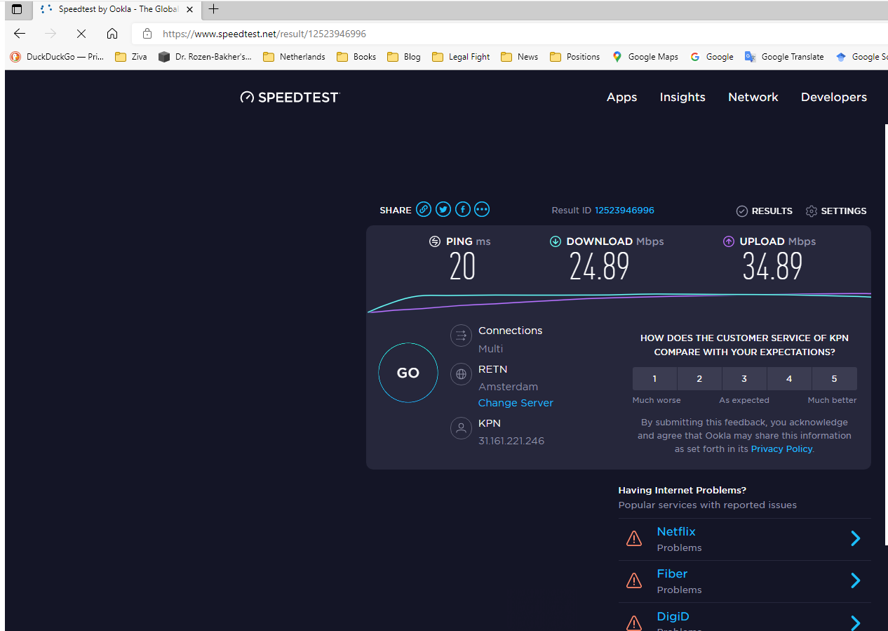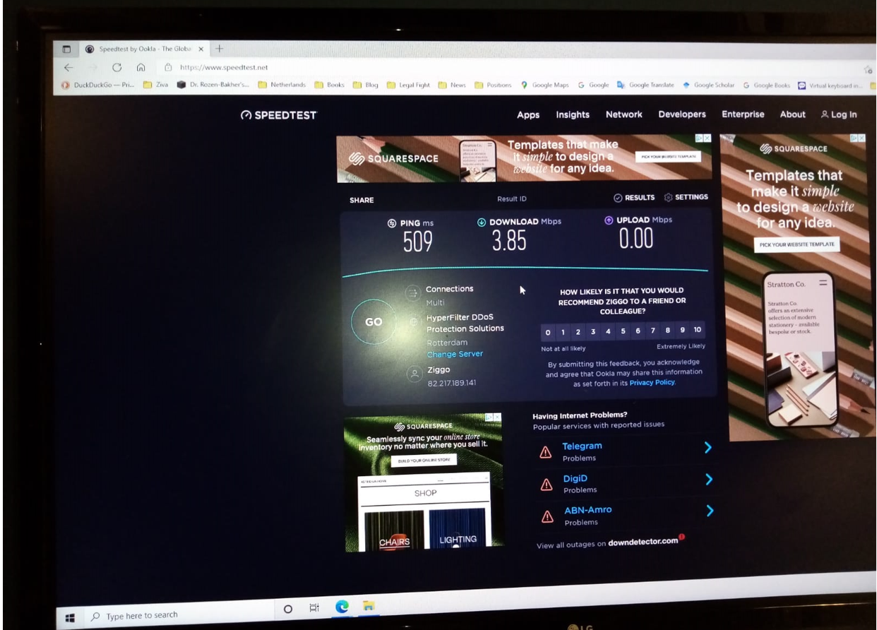 On 27 December 2021 at 19:45, the internet speed of Ziggo was intentionally reduced to interfere with working online on the pages of the website of Dr. Rozen-Bakher related to the legal fight. It was so slow that it was not allowed at all to work online, so Dr. Rozen-Bakher was needed to work online via the hot-spot of her KPN mobile that its internet speed was normal via her mobile. Please see the screenshots of the test speed of the internet of Ziggo compared to the mobile of KPN.