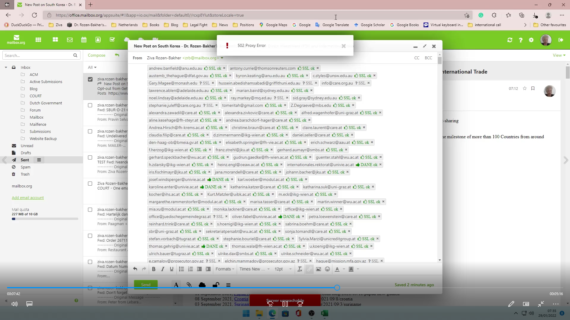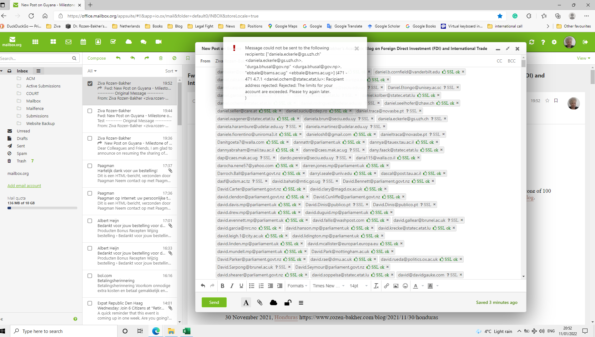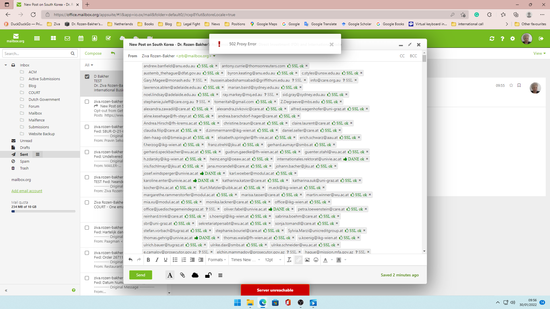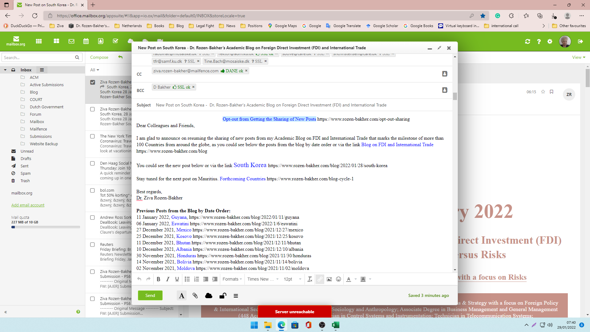 A Test email was sent successfully without a ‘Server Problem’, while three failed attempts of sending the blog to Dr. Rozen-Bakher’s contact list were due to a ‘server problem’. Since 17 December 2022 when Dr. Rozen-Bakher opened the mailbox account of Mailbox.Org, she NEVER succeeded to send any email of the blog or forum to her contact list via Mailbox.Org. It’s total Blocking of her communication with her contact list. This follows the previous blocking of her blog via mailboxes of KPN, Ziggo, Gmail, Mailfence, either partly or totally.