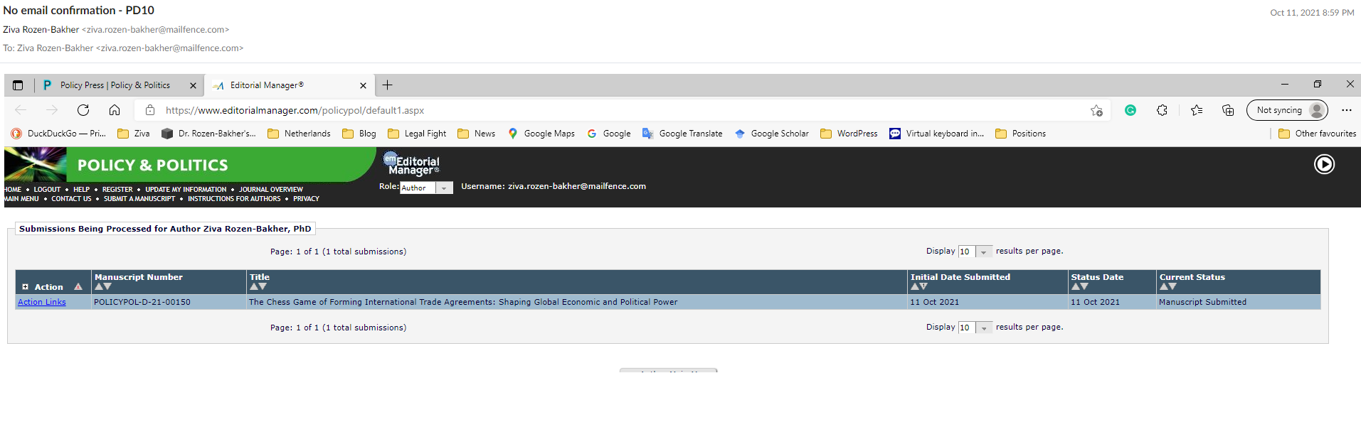 A confirmation email for the submission was sent to the old email of KPN instead of to the new email of Mailfence, despite that the new email of Mailfence was changed before submission regarding the email address and the user name. That’s done via cyber by reversing the change of the email address to sabotage receiving the confirmation email, so the system of the journal shows in parallel the past email of KPN along with the new email of Mailfence, despite that it was changed both regarding the user name and the email address. Besides, email about the problem to the journal was blocked via the journal system, while the draft email about the problem via the mailbox of Mailfence was blocked to view or sent, so it was only possible to view the source of the draft email.