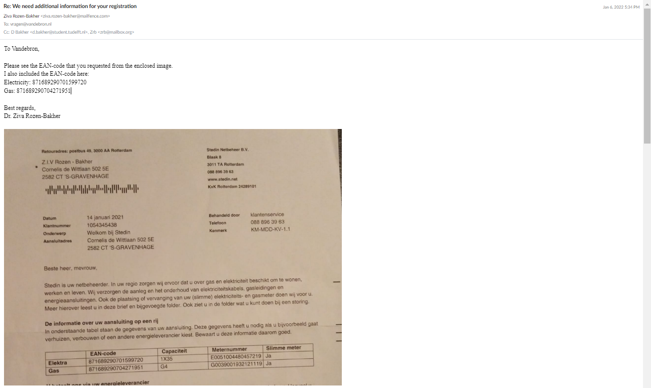 09 January 2022, Intense Cyber regarding the New Contract with Vandebron - Electricity and Gas Supplier. Following the application for a new contract, Vandebron requested to provide the EAN codes for the Electricity and Gas. However, ICCG tried to prevent giving the EAN codes via intense cyber that prevent writing details in the email by creating gibberish instead of the words that actually written. This cyber method is used frequently by ICCG, especially in cases of sabotage sending emails that ICCG doesn't like. To bypass this cyber method, the email wrote in notepad and after that was copied to the email. Besides, To bypass any manipulation with the content of the EAN codes, Dr. Rozen-Bakher also provided in the email a screenshot of the EAN codes.
