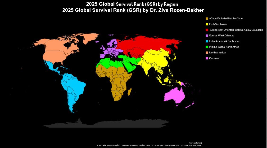 Section E7. Regional Classification: All UN Members and Non-UN Members, 2025 Global Survival Rank (GSR) by Dr. Ziva Rozen-Bakher https://www.rozen-bakher.com/gsr/2025/e/region
