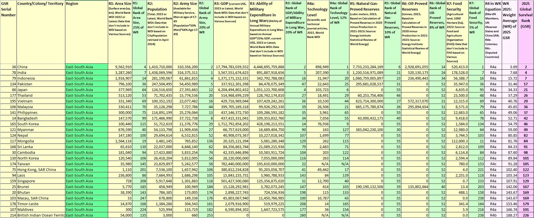 List of UN Members and Non-UN Members included in East-South Asia: Indicators (R1-R7) of Global Survival Rank, sorted by 2025 Global Survival Rank (GSR) by Dr. Ziva Rozen-Bakher