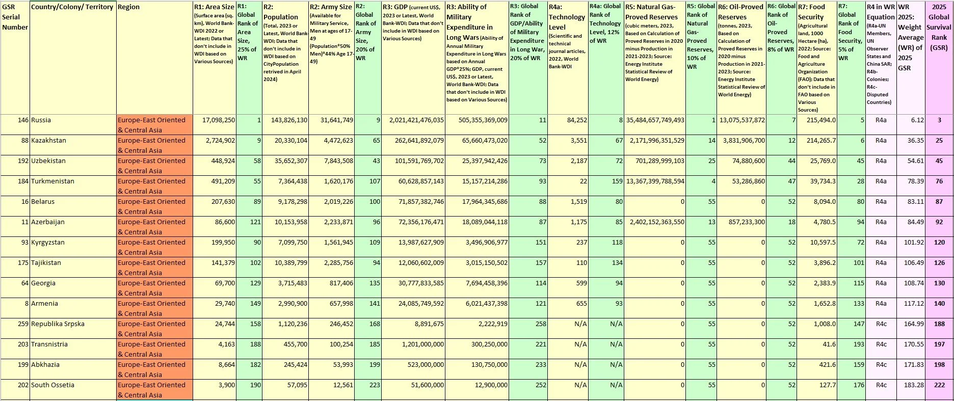 List of UN Members and Non-UN Members included in Europe-East Oriented, Central Asia and Caucasus: Indicators (R1-R7) of Global Survival Rank, sorted by 2025 Global Survival Rank (GSR) by Dr. Ziva Rozen-Bakher