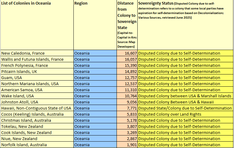 List of Colonies in Oceania region, sorted by Distance from Sovereign State