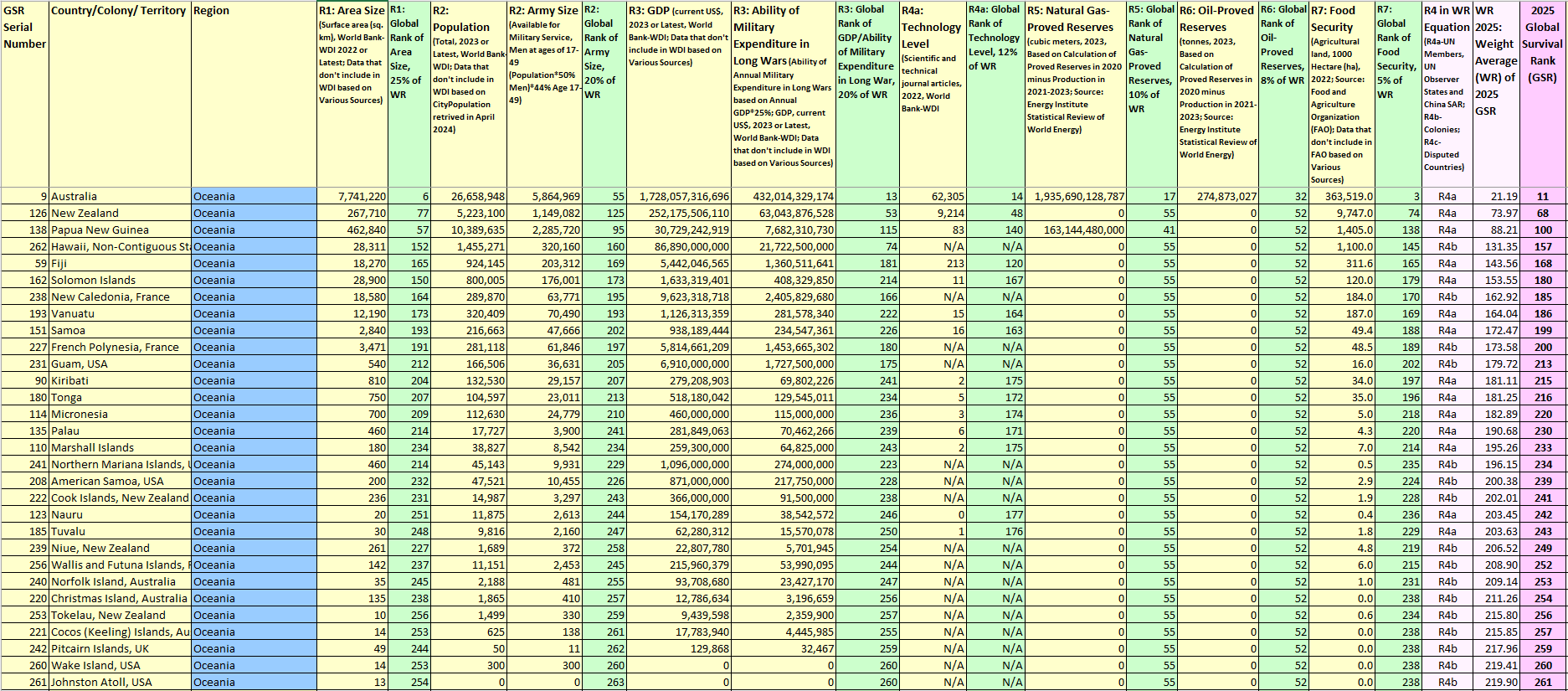 List of UN Members and Non-UN Members included in Oceania: Indicators (R1-R7) of Global Survival Rank, sorted by 2025 Global Survival Rank (GSR) by Dr. Ziva Rozen-Bakher
