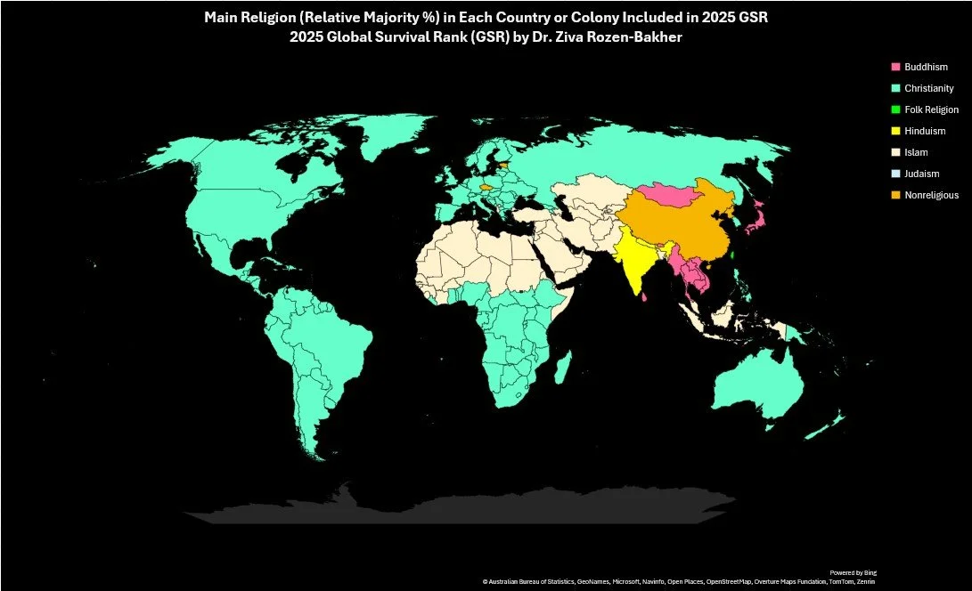 Section E8. Religion Classification: All UN Members and Non-UN Members, 2025 Global Survival Rank (GSR) by Dr. Ziva Rozen-Bakher https://www.rozen-bakher.com/gsr/2025/e/religion
