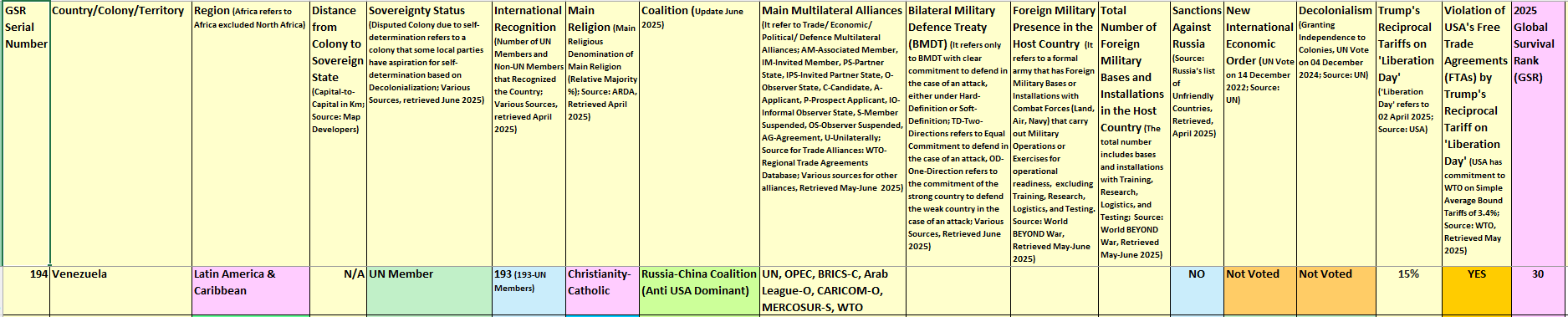 Venezuela: Geopolitical Position and Indicators (R1-R7) of Global Survival Rank, 2025 Global Survival Rank (GSR) by Dr. Ziva Rozen-Bakher