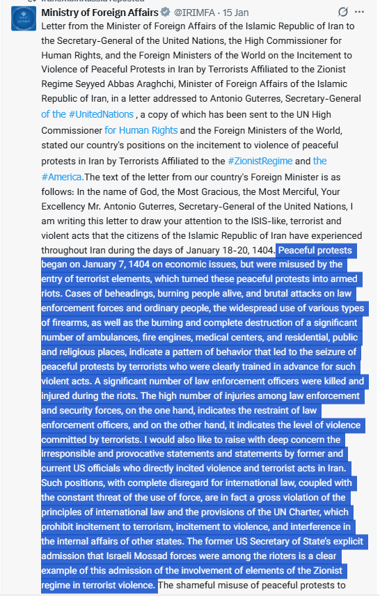 Video showing the Armed-Riots in Iran: https://x.com/SAMOUSAVI9/status/2014304764704469441