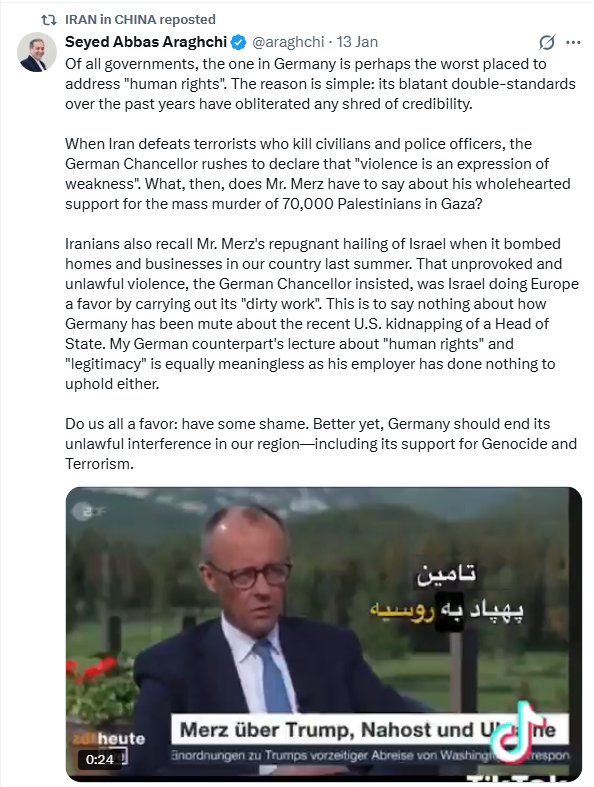 As an EU citizen, it is sad for me to see the ‘Double Standards’ of the EU, especially by Germany. On the one hand, Germany supports Israel in the Genocide in Gaza by providing Israel weapons, aid, and political support in the international arena, including designating Hamas as ‘Terrorists’ because they resist the horrific Israeli occupation and Israeli genocide. Worse, Germany even handles in a harsh way those who protest in Germany against the Israeli genocide in Gaza. Paradoxically, Germany became the protector of Israel against criticism in a way that Antisemitism serves as a tool to defuse criticism against Israel, especially in relation to violations of human rights by Israel (see my previous comment below), while Germany does not protect those who suffer from the Israeli Genocide, so unfortunately, the Chancellor of Germany, Friedrich Merz, breaks the promise of ‘Never Again’!. On the other hand, Germany condemns the ‘violation of human rights’ by Iran when Iran fights against the USA and Israel, who try to impose on the Iranian nation a ‘King-the son of the Shah’ via Armed-Riots-backed by the CIA and the Mossad, only because the USA wants the Oil and Gas of Iran, Oil and Gas that the EU and Germany need so much due to Sanctions against Russia. What's next in this plot? Re-establish the SAVAK by the CIA to hold by force the ‘Shah Prince’ as the ruler of Iran against the wish of the Iranian people, a ‘Shah Prince’ that will be run by the ‘Acting King Trump’.